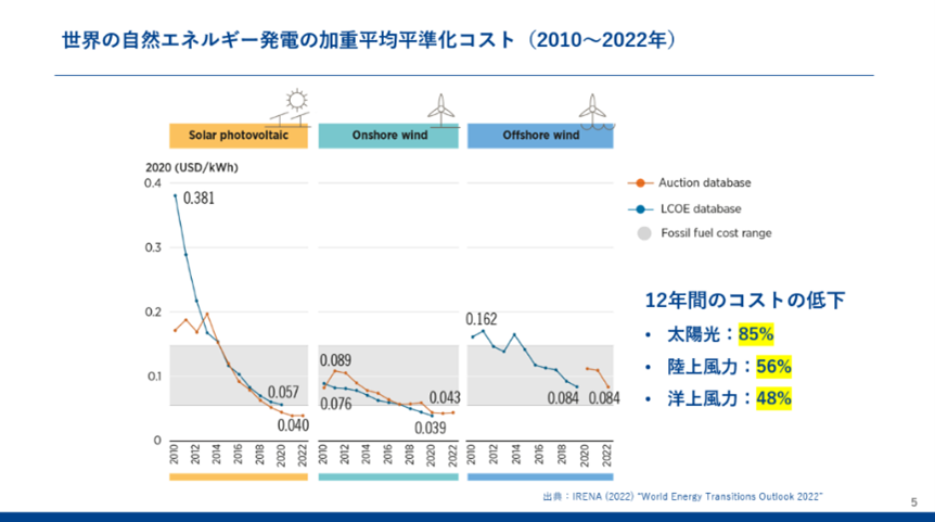 古屋さんからは、映画が撮影された2018年から現在までにどれだけ技術が進化しているかをご説明いただきました。太陽光エネルギーによる発電コストが、化石燃料による発電よりも安くなっているなど、一般にはあまり知られていない事実がありました。