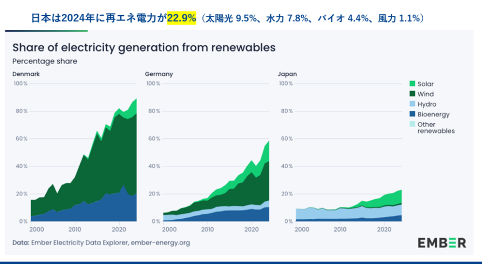 これに伴い、再エネの普及も加速しています。日本ではまだ23%程度で停滞している一方で、ドイツでは約60%、デンマークでは約90%と、カーボンニュートラルの実現が目前に迫っているそうです。