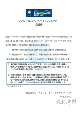 株式会社ピープルフォーカス・コンサルティング(代表取締役 松村 卓朗/以下、PFC)は、7月1日に一般社団法人グローバル・コンパクト・ネットワーク・ジャパン(所在地:東京都渋谷区、代表 理事:有馬利男、以下 GCNJ)の「GCNJ コレクティブ・アクション 2030 宣言書」に署名しました。
