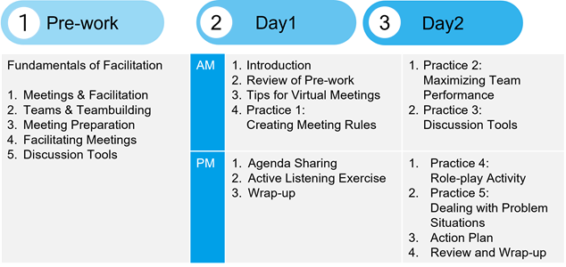 ※本講座は、ファシリテーション研修の英語版です。英語の文化背景にコンテンツを調整する場合もありますが、日本語版とアジェンダは同じです。